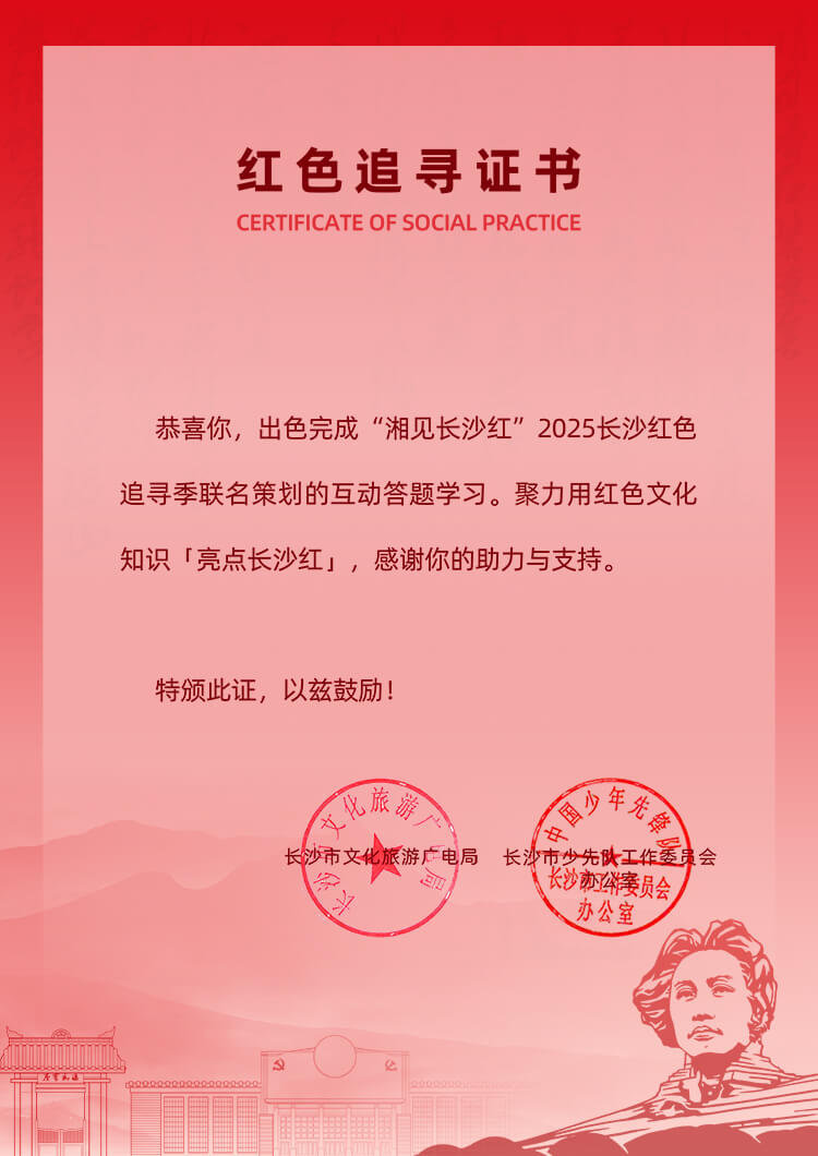 2.参与H5答题答对6题及以上,点击"红色追寻证书"保存作为兑换凭证 或转发“点亮长沙红助力”H5到朋友圈,活动期间前往以下参与机构 指定地点,出示图片,领取实体护照,开启参与线下打卡集章;